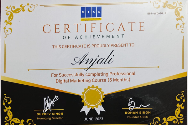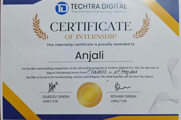 Hi! I’m Anjali from Delhi. My journey in digital marketing began in 2023 when I completed my Advance Digital Marketing Course from MISD Institute, Lajpat Nagar. During that time, I was eager to understand how the digital world worked, so I joined Techtra Digital Pvt. Ltd. as an intern from February 2023 to May 2023. Those months helped me learn the basics of campaigns, content, and client coordination.